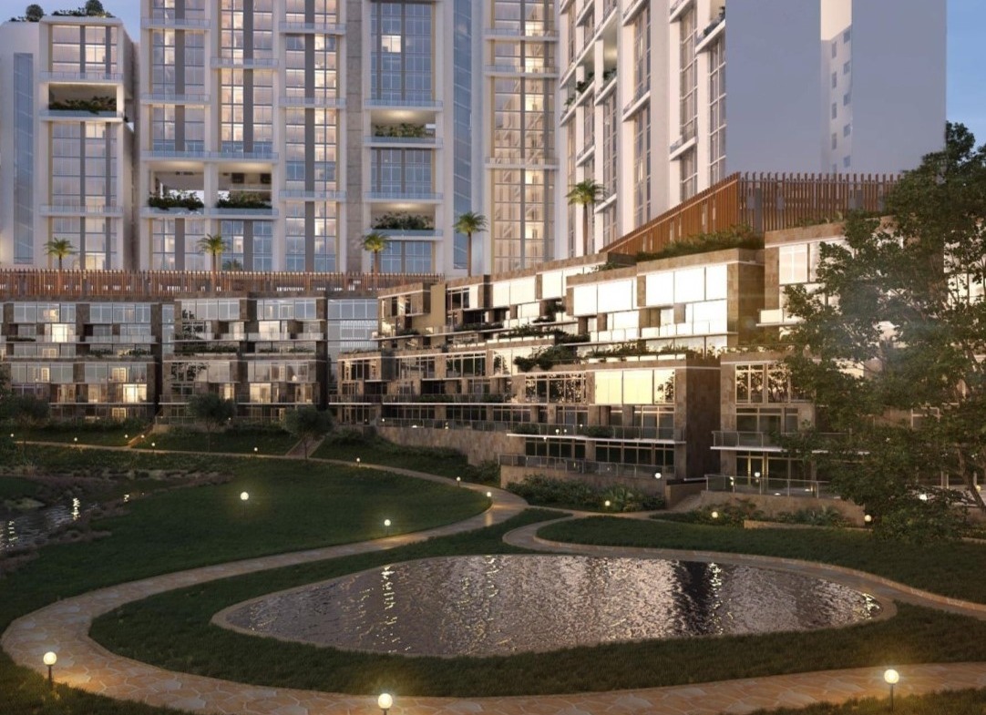 A multi-level clubhouse with an entertainment hall (fitted with kitchen, heated pool, a fully equipped gym and a roof terrace with greenery.)